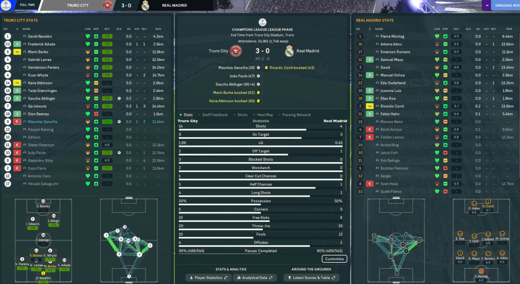 Truro’s second Champions League campaign began with Paulo, 18-year-old homegrown striker Dion Beeney and Ablinger earning a comfortable 3-0 win at home to Salzburg. Adade and Genofre earned a 2-1 win at Villa before welcoming Real Madrid to Truro for the first time. They made a bright start as a brilliant passing move ended with Genofre converting from 18 yards, another great move was finished off by Paulo 90 seconds after halftime and Ablinger smashed a third in injury time.