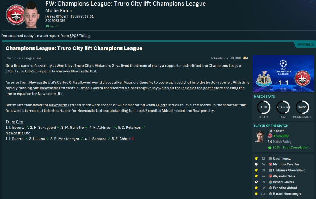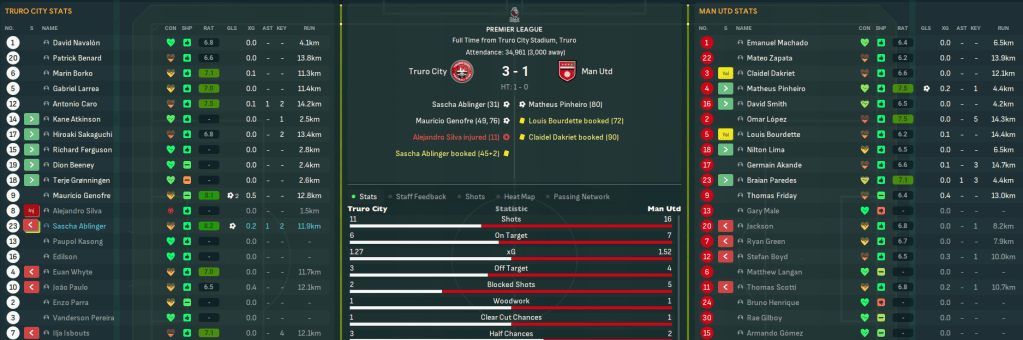 Game 4 – Brighton (9th, away): With a bottlejob looking a possibility, Truro travelled to Brighton while UFC hosted a Manchester Derby. Truro started well as Ablinger’s low cross was converted by Genofre to tie Jaze Kabia’s club record 29 goals in the first season of the save. Great play by Silva teed up Ablinger to double the lead and Isbouts wrapped up an easy 3-0 win late on. UFC thrashed City 5-0.
