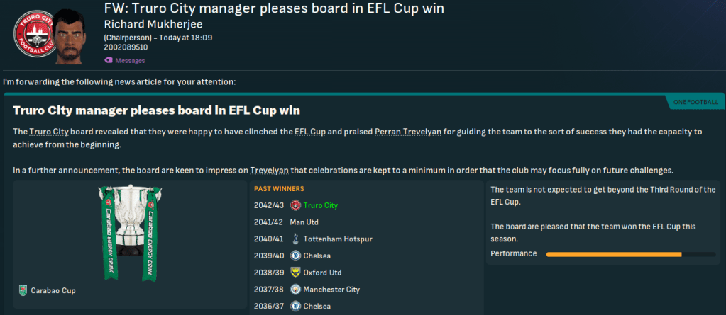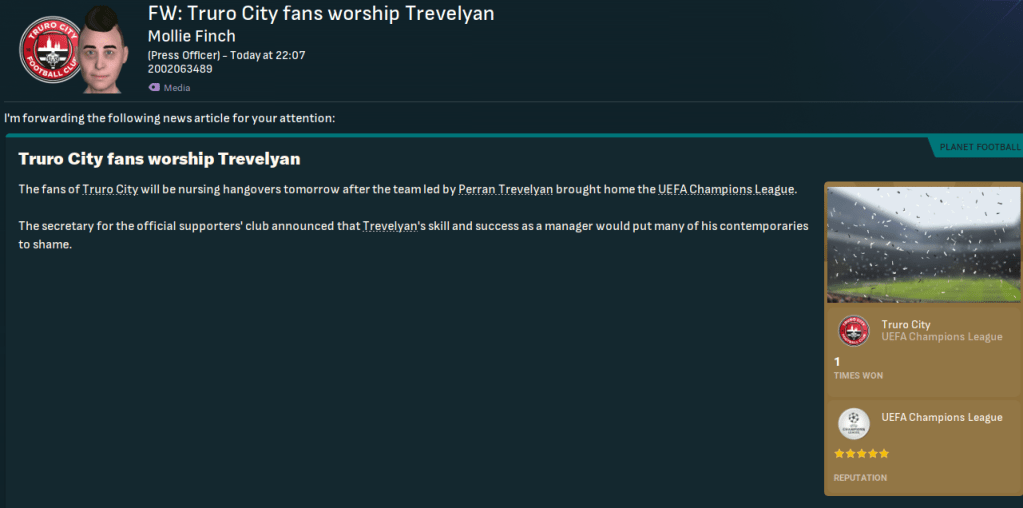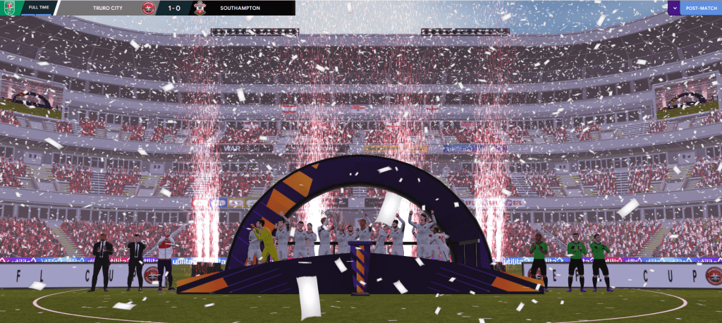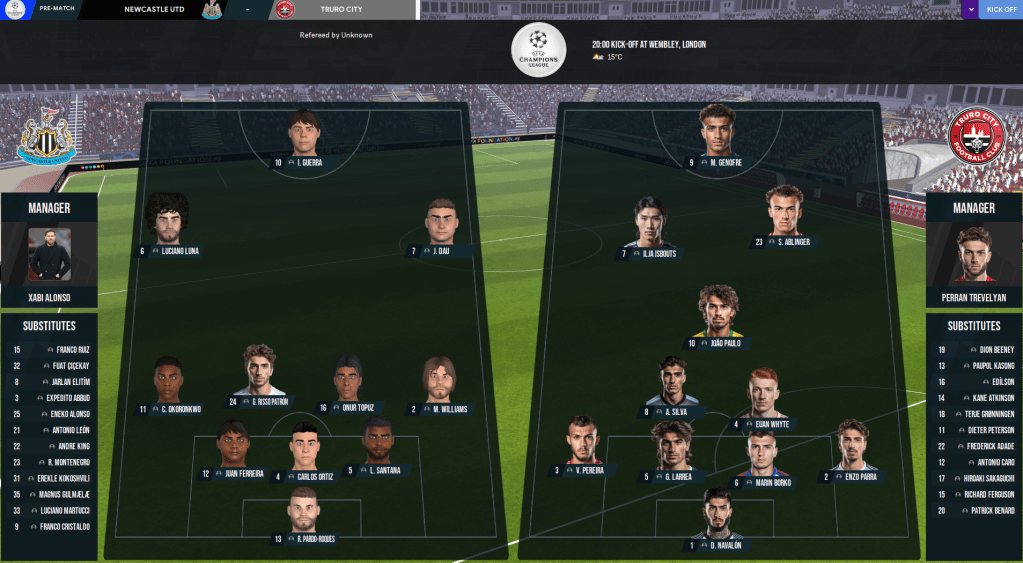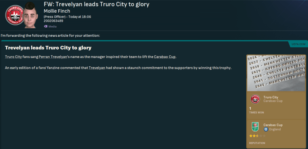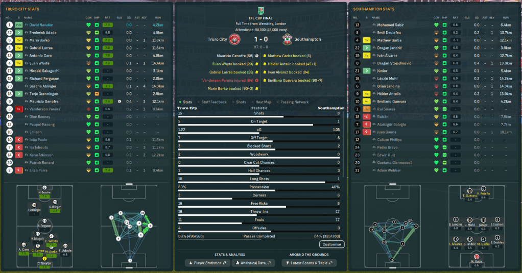 Truro brought that fine league and continental form into the domestic cups as they defeated Man City and Newcastle away then West Ham 3-0 at home. They faced Reading in the semis and a tired team snuck a 2-1 home before a 0-0 at home to reach the club’s second Carabao Final. Southampton beat Newcastle to tee up an intriguing Final, for which Trevelyan lined up: