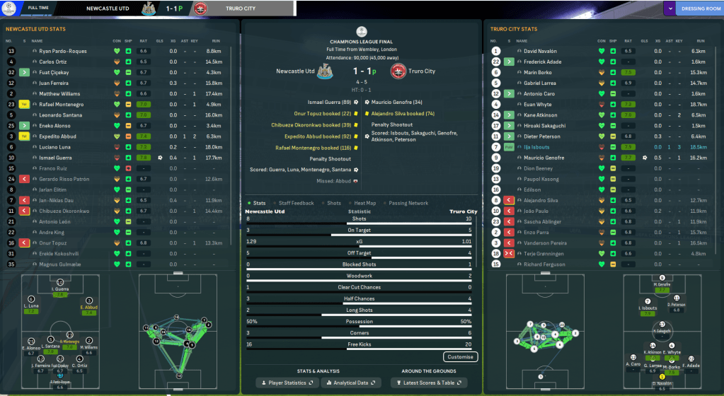 Fans from Cornwall and the north east didn’t have too far to travel as Truro’s maiden Champions League Final saw them face holders Newcastle United at Wembley. Trevelyan just about had star man Parra back fit, so he lined up: