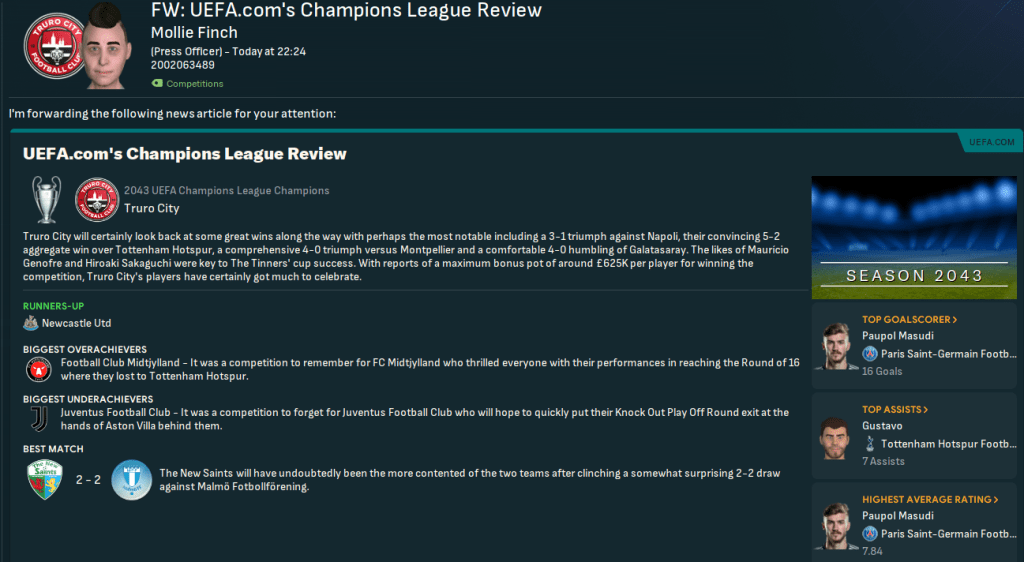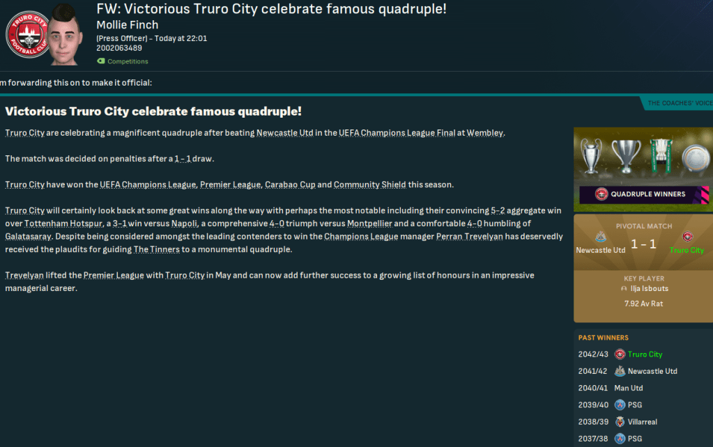 Truro’s efforts were rewarded with personal accolades as Navalón became the club’s first winner of World’s Best Goalkeeper and was named in the FIFA World XI, while Isbouts became the club’s second European Golden Boy winner after Genofre in 2039. At the end of the season, the excellent Parra won Football Writers Football of the Year and PFA Player of the Year – from right back, Ablinger won PFA Young Player of the Year, Navalón won the Golden Glove and Trevelyan won Manager of the Year. While Navalón, Parra, Borko, Pereira and Genofre all made the Team of the Year.