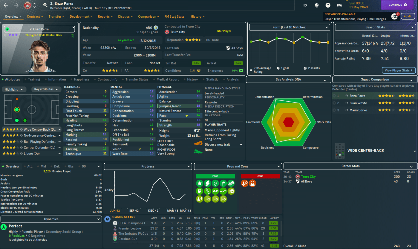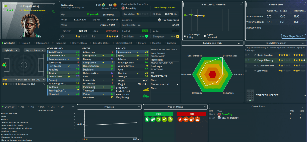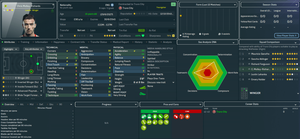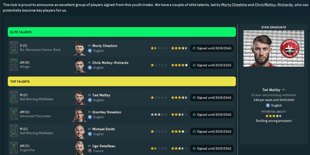 Truro also had a decent youth intake led by 5-star potential striker Chris Molloy-Richards, along with 4.5-star potential centre back Morty Cheshire and midfielder Ted Maltby.