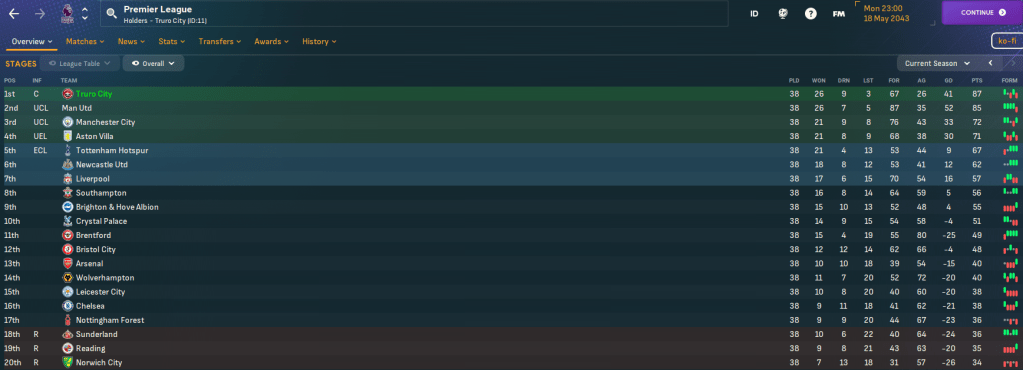 So despite a pretty shaky conclusion, Truro held on to wrap up back-to-back titles. They finished on 87 points, 6 more than last season, after 26 wins, 9 draws and 3 defeats, scoring just 67 and conceding a league low 26. Genofre was the joint-top scorer with 18 goals and Navalón topped the clean sheets with 19. But the star man was Parra with a ridiculous 7.51 average rating – and it was no coincidence that their wobble occurred when the right back was injured. A thrilling relegation fight saw Reading go down despite their final-day heroics, while Arsenal and Chelsea both survived by the skin of their teeth.