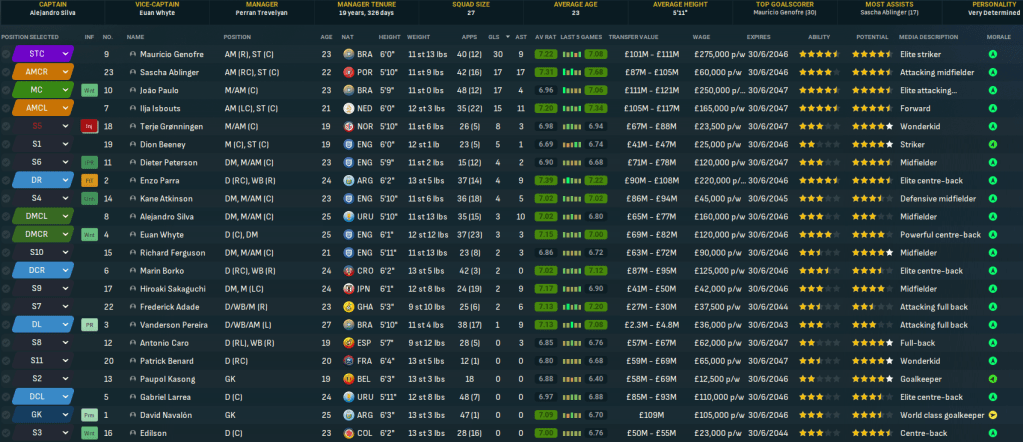 Mahtal obviously stuck with the title-winning narrow 4-3-3 approach, with a bit more competition for places across the squad. The only question mark was who to play in the shadow striker role, with Dieter Peterson competing with the likes of Sascha Ablinger, Gronningen and Richard Ferguson.