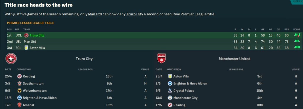 The unbeaten run continued with 1-1 draws at Chelsea and Villa either side of cup matches before a rotated side defeated Liverpool 2-1. That saw Truro set a new Premier League record of 54 matches without defeat since December 2041! But the run ended as a fully rotated team to rest for European matters fell to a 3-0 loss at Palace. Two weeks later, they put and the FA Cup defeat to Liverpool right as Genofre’s hat trick led a 6-0 demolition of Bristol City, which was surprisingly a club record usurping a 7-2 win over Plymouth. That kept Truro 7 points clear of UFC going into a two-horse title race.