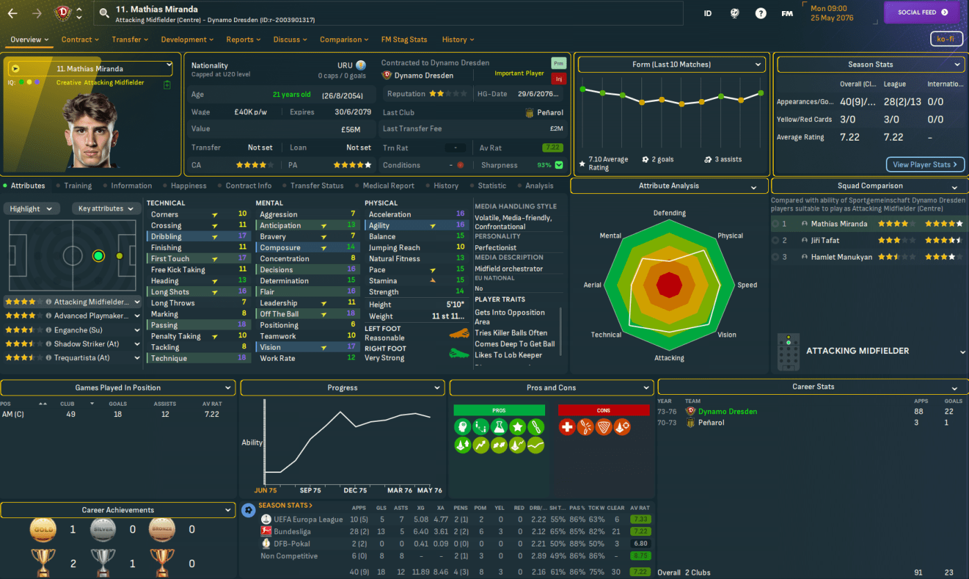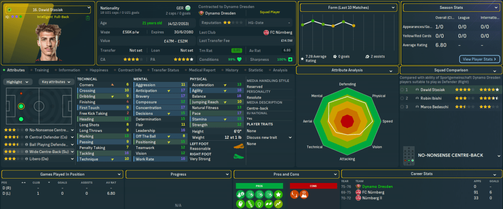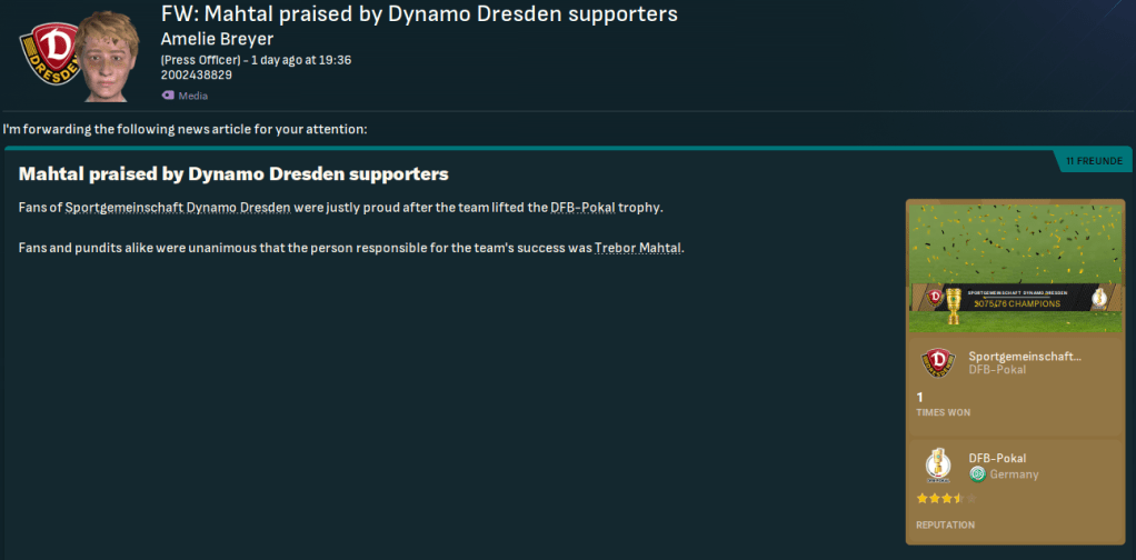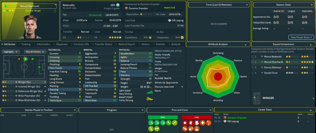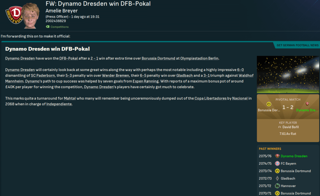 Dynamo Dresden defied all expectations to finish 6th in Bundesliga and qualify for European football in 2074/75. Manager Trebor Mahtal now had to strengthen key areas of the squad to compete on all fronts, try and close the gap to Germany’s big boys and, ideally, give them a more offensive threat.