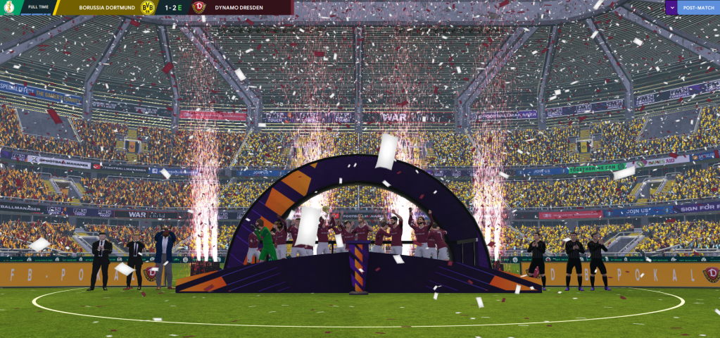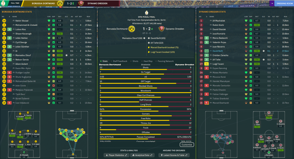 Eberhardt had a long shot 40 seconds in, which proved to be Dresden’s only of a first half that Dortmund bossed but only got one shot on target. Ronning had a huge chance 10 minutes after the break but, unsurprisingly, sent his shot well wide of the target. He then somehow missed an open goal as a cross bobbled to him six yards out. Dresden continued to frustrate Dortmund, who had 17 shots, and, for the second time in four days, they went to extra time. This time, Dresden landed the first blow as Zaracho got in down the right and his cross rebounded to Boril 20 yards out, and his shot was fumbled into the net by the keeper. Dortmund continued to punish and were hit on the counter as Tavani latched onto a clearance and crossed for the half-injured Tafat to slam home on the volley. Dortmund got one back but Dresden held on for a pretty undeserved but very special victory.