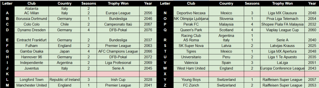 Ticking off two of the trickiest letters would not be easy. K would likely rely on a Japanese side sacking their manager. And X seemed virtually impossible, with the only realistic options being Swiss side Neuchâtel Xamax and Tijuana (Xoloitzcuintles) in Mexico. Unsurprisingly, upon resigning, no applicable jobs were available, so Mahtal enjoyed some time away and accepted a few punditry offers at Euro 2076 in Norway, which England won by beating Poland 3-0 in the final.