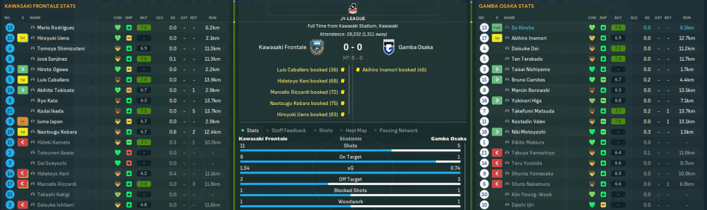 Game 4 – Gamba Osaka (2nd, home): Three days later, a potential title decider saw Gamba make the trip to their former manager. Both teams had good chances inside two minutes with Gamba forcing a good save out of Rodríguez before Kobara hit the bar. Kawasaki did enough to win it but poor finishing cost them and they drew 0-0.