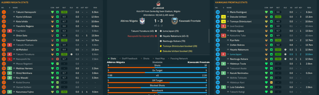 Game 3 – Yokohama F Marinos (3rd, away): Two huge games followed, starting with a trip to outside title hopefuls YFM. Neither side really got going and a dubious penalty just before half time gifted YFM a 1-0 win. At the same time, Gamba beat Kashima 4-0 to go top by 2 points.