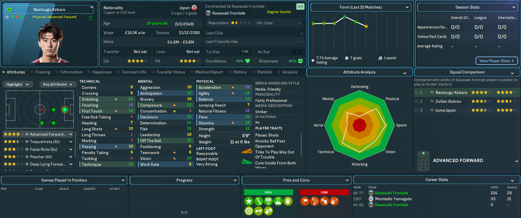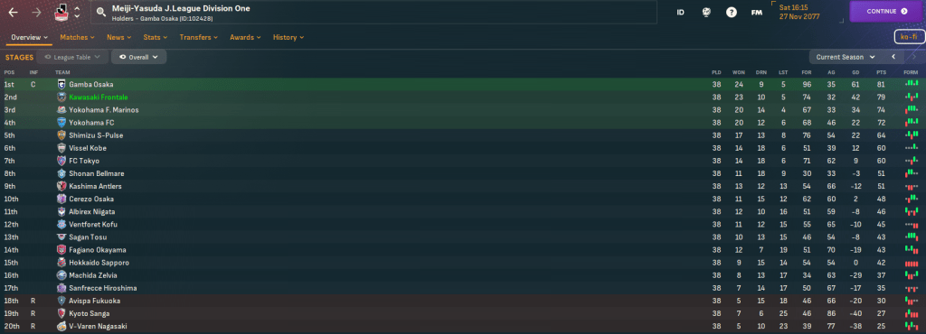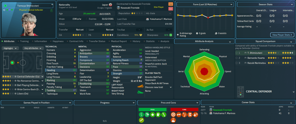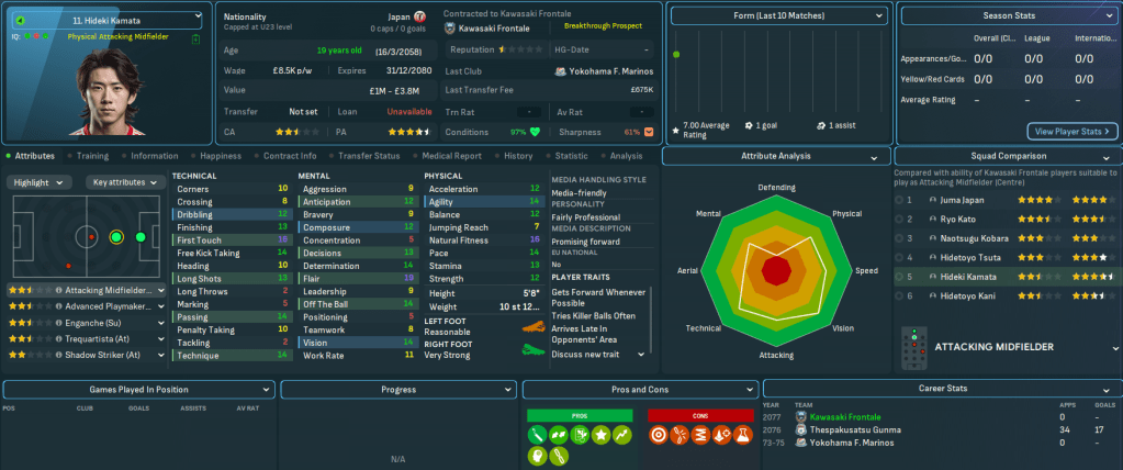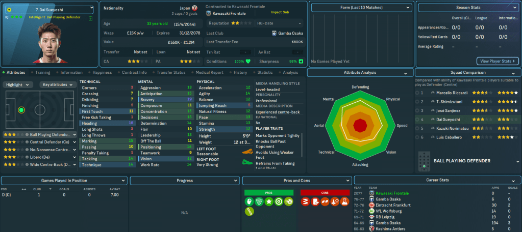 Kawasaki had to wait 20 years to win its first J1 League title in 2017 and quickly added three more in the next four years. It’s added five more during this save, the most recent coming nine years ago back in 2068, and come runner-up in the AFC Champions League in 2037, 2056 and 2074. Frontale play at the 26,632 capacity Kawasaki Stadium, which was built way back in 1962 and is supported by 20 youth recruitment, 16 training facilities and junior coaching and 15 youth facilities. The club has £60m in the bank aided by some big sales in recent seasons, but is overspending its £250k wage budget by £93k, which Mahtal quickly rectified by selling off a few aging players for around £20m.