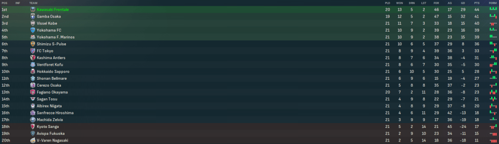 Game 1 – FC Tokyo (6th, away): A tricky game at Tokyo saw Kawasaki start terribly and go 2-0 down inside half an hour. But they rallied after the break and Japan and Kobara dragged them level to earn a point. The next day, Gamba also drew 2-2 with Sagan and YFM lost 1-0 at home to Machida.