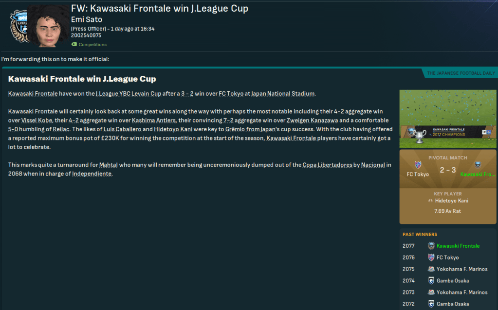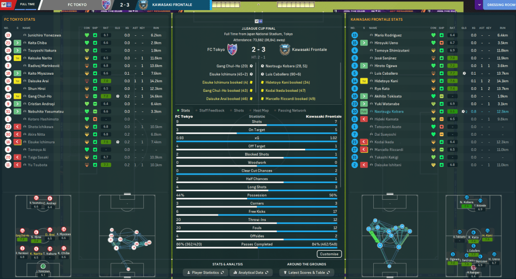 Kawasaki reached back-to-back J.League Cup Finals in 2074 and 2075 only to lose to Gamba and YFM, but hadn’t won’t the tournament since 2067. They now faced rivals and holders FC Tokyo in a Tamagawa Classic final at the Japan National Stadium. Frustratingly, Japan sprained his knee ligaments four days before the big game, so Mahtal lined up: