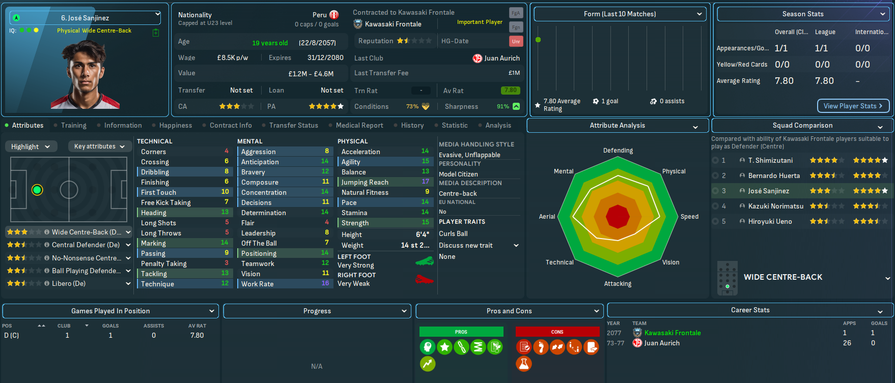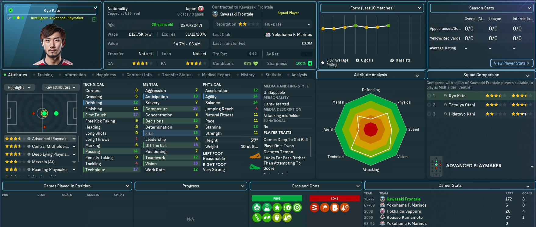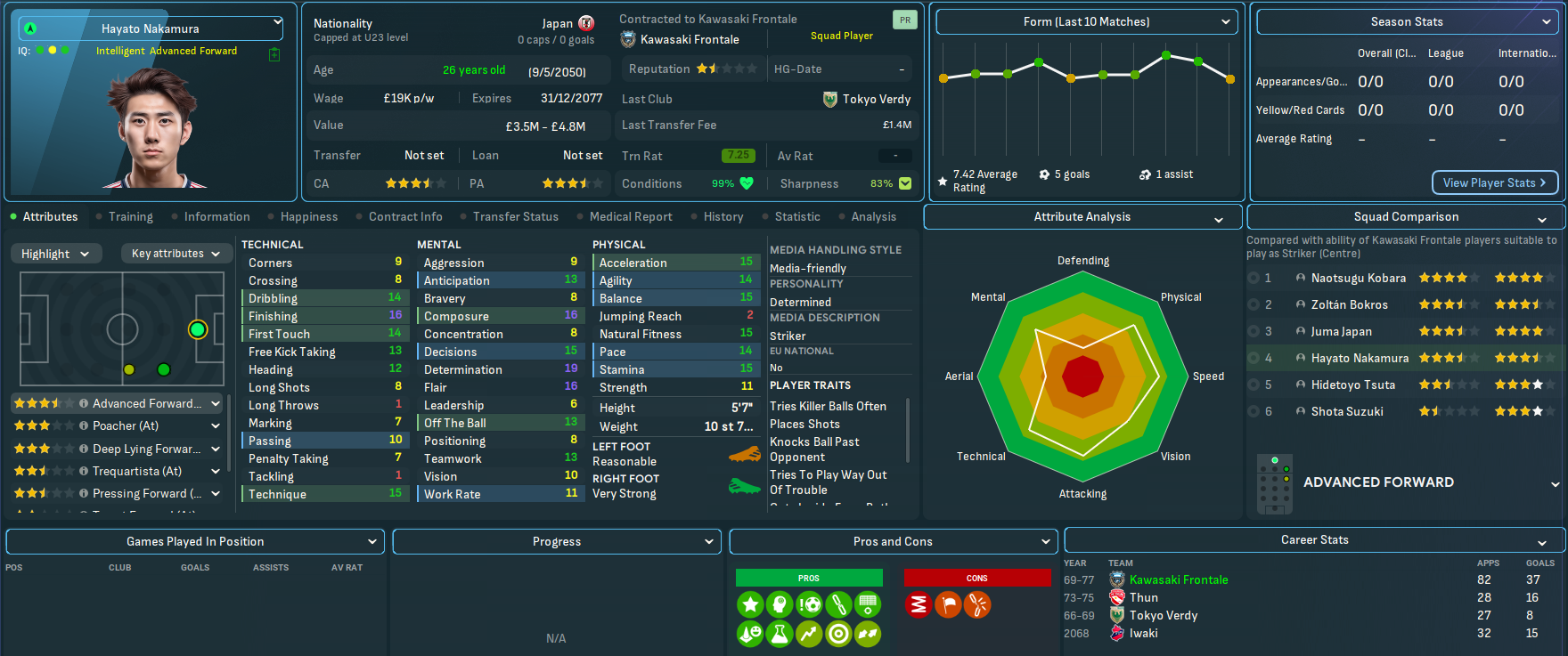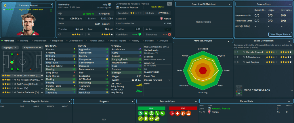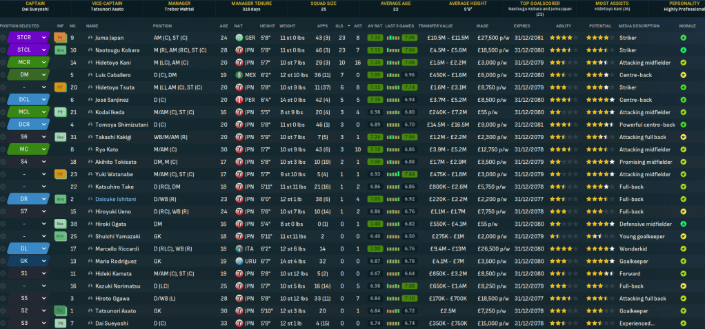 Mahtal sold on a few more players in July, including Bokros going back to Romania for £3m and Yokohama, who refused to sign a new contract, going to Gamba for £1m. He bolstered the defence, including a bit of experience in his former Gamba centre back Dai Sueyoshi, now 33, for £600k and wonderkid left back Marcello Riccardi for £7m from Monza, before adding promising attacker Hideki Kamata for £675k from YFM.