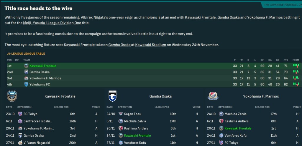 The run-in began with Kato edging a 2-1 win at Kashima, while Gamba lost their first league game for four months at Niigata to take Kawasaki top. A tired team handed that advantage back at Cerezo Osaka but another Japan double downed Kofu 2-0 the day after Gamba drew at Shonan. That left Kawasaki one point clear of Gamba and seven ahead of YFM going into the final five games, which included back-to-back games against their title rivals.
