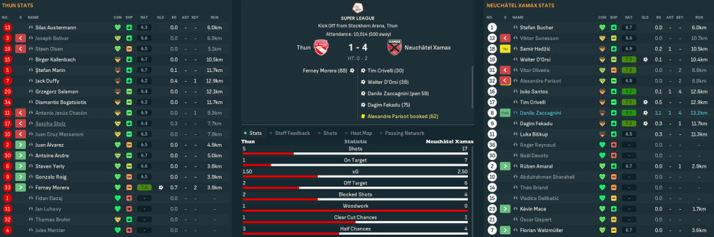 The best player at Xamax is midfielder Joao Santos, along with winger Danilo Zaccagnini, who intends to leave at the end of the season, goalkeeper Stefan Bucher, midfielder Florian Welzmuller, left back Rúben Amaral, centre backs 6ft 5in Walter D’Orsi and Samir Hadzic and striker Dagim Fekadu. They also had a few exciting prospects led by full backs Vitor Oliveira and Kévin Mace and midfielder Alexandre Parisot.