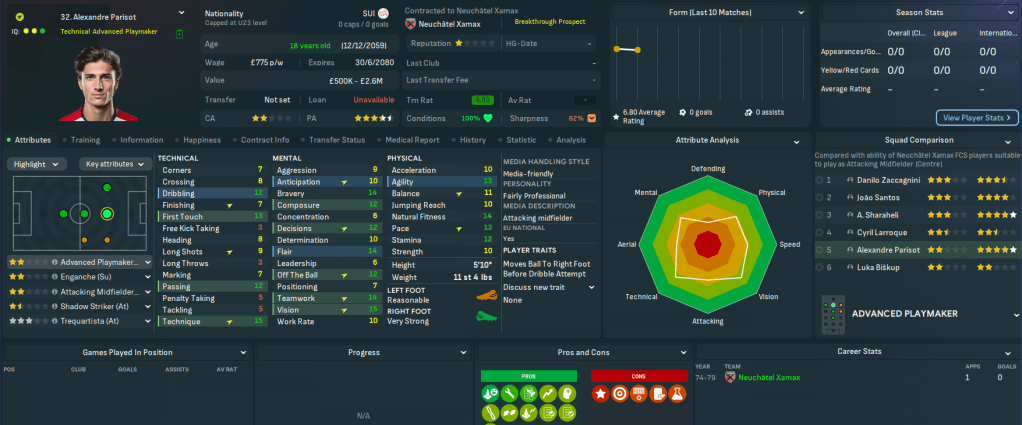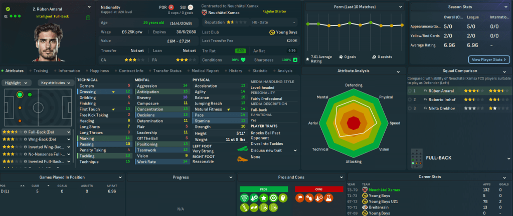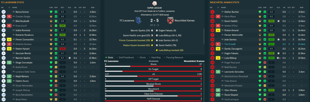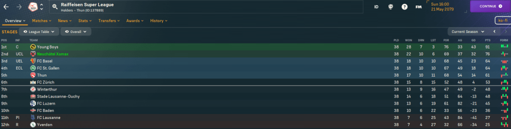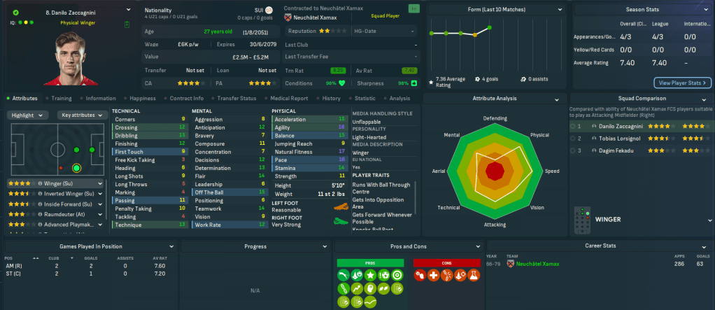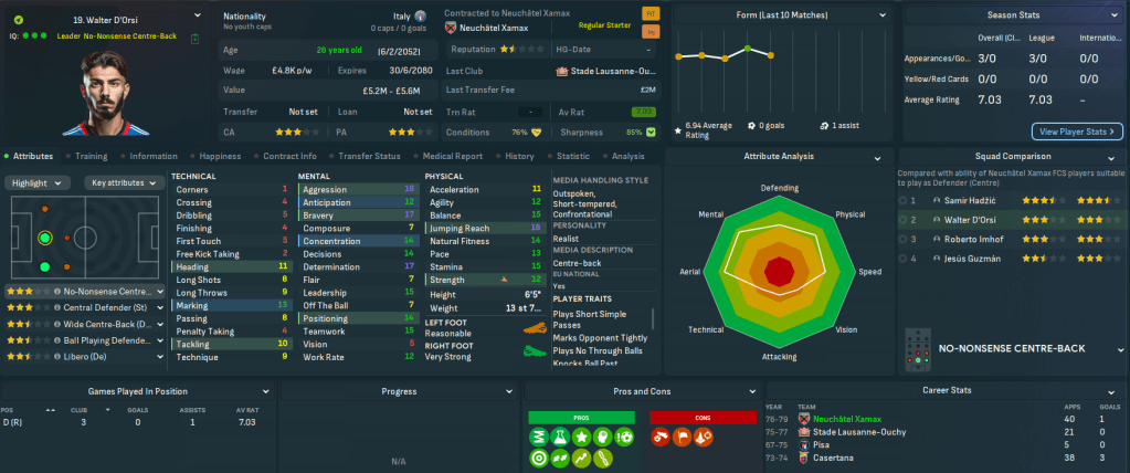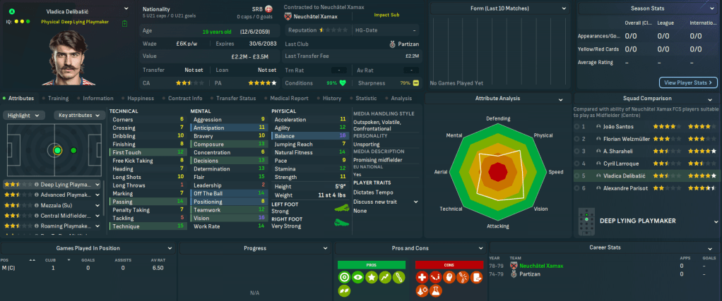 Mahtal joined three games into the 2078/79 campaign, with Xamax sitting 2nd after two wins and a draw. His first game came a few days after his arrival and, despite being completely unprepared, he picked up a 3-1 win at Winterthur. A week later, a Zaccagnini brace secured the same result at home to rivals Yverdon and Biskup’s header nicked a 1-0 win at home to Lausanne. The unbeaten start continued with 2-2s at Mahtal’s former club Young Boys and at home to Basel before D’Orsi headed the only goal at Zurich and Bishup and Zaccagnini earned an impressive 2-0 win over Thun.