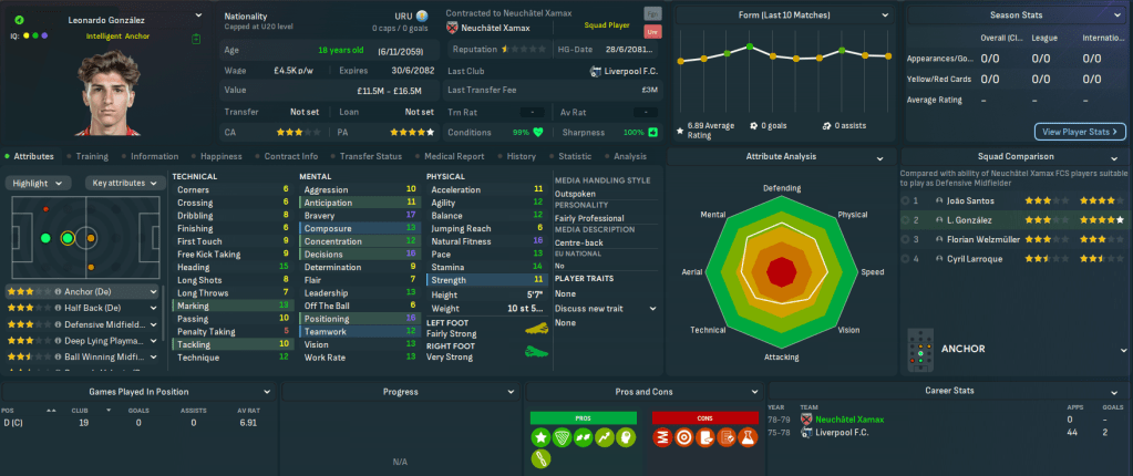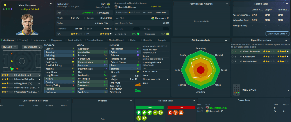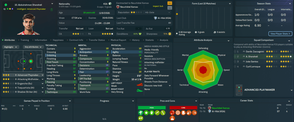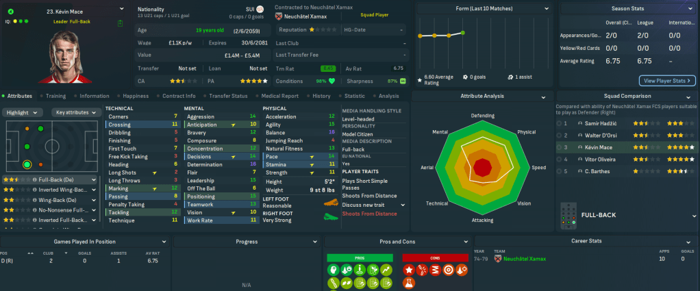 Les Xamaxiens won the Swiss title for the first time in 1916, then back-to-back in 1987 and 1988. It’s also reached five Swiss Cup finals, but lost on all five occasions. But it’s put that right in the last three seasons of this save, winning the cup in 2076 and last season. Xamaz play at the 11,997-capacity Stade de la Maladiére, wich was built in 2007 and is supported by 17 youth recruitment, 16 junior coaching, 15 training facilities and 12 youth recruitment. But Mahtal with the club in a strong financial position as the bank balance was at £50m and a transfer budget of £20m and £90k of a £230k wage budget going spare.