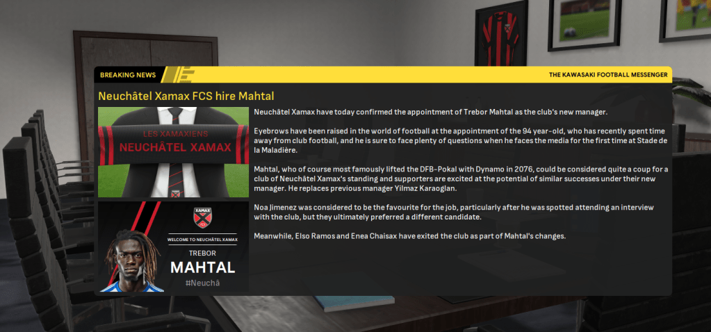 Realistically, the only clubs that could allow Mahtal to tick off the letter X were Swiss side Neuchâtel Xamax and Tijuana (Xoloitzcuintles) in Mexico. Unsurprisingly, neither job was vacant upon Mahtal’s resignation in November 2077. Neuchâtel’s manager had been in charge for nearly a year and was overperforming in 7th having been predicted to finish 9th. Tijuana’s manager had only been in charge for 55 days and finished next to bottom of Liga Apertura, having been predicted to finish 13th.
