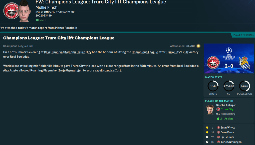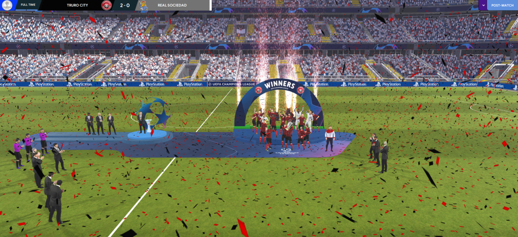 In the Champions League, they nicked a 2-2 at Inter before winning five on the bounce and dominated PSV 3-0 on the final day to qualify in 5th. Genofre and Paulo earned a 2-1 win in Dortmund before Andries nicked a 1-0 for a fully rotated team in Cornwall. A favourable quarter-final draw saw Truro face Villarreal, and Whyte and Ablinger strikes were enough for another 2-1 first-leg success before Genofre’s 72nd-minute header nicked a 1-1 in Spain. That teed up an all-English semi with Newcastle, while Spurs faced Sociedad. A long trip northeast was up first, and Ablinger’s late strike rescued a 1-1. Back in Truro, Paulo and Gronningen’s first-half strikes were enough for a dominant 2-1 win to book Truro’s fourth successive Champions League Final.