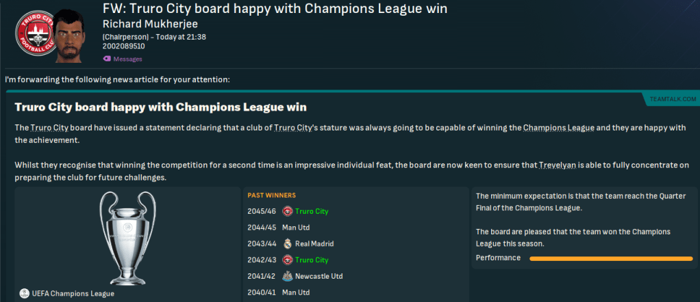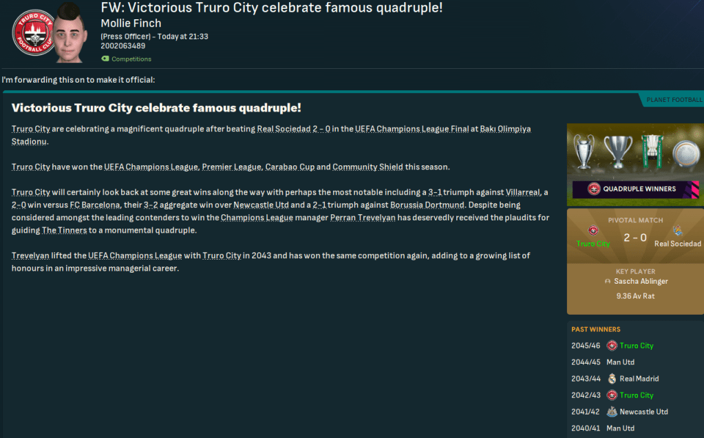 Truro City became the 10th most successful club in English history as they tied Sheffield Wednesday on four league titles in 2045. However, Perran Trevelyan’s side suffered the heartbreak of back-to-back Champions League Final defeats.