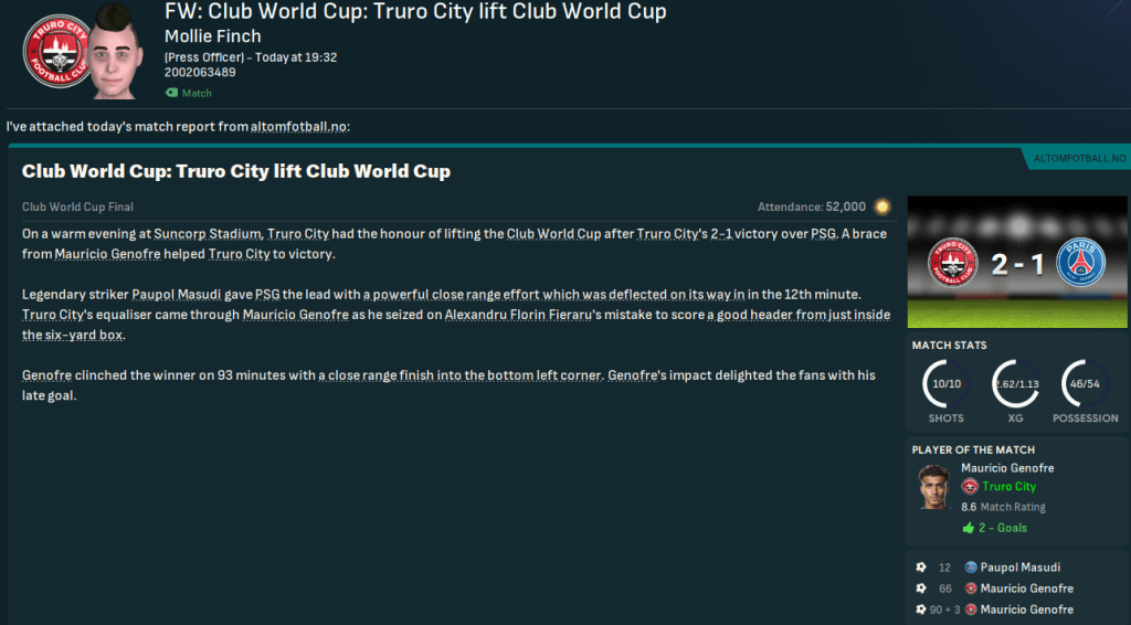 That teed up a Club World Cup Final against PSG, who defeated Leipzig 1-0 in the semis, at Suncorp Stadium in Brisbane. truro started slowly and went behind after 12 minutes. Trevelyan laid into them at the break and moved to a wide 4-3-3, which worked as right back Enzo Parra’s cross was headed in by Genofre. The game looked to be going to extra time until wonderkid Martín Larrosa’s low cross was turned in by Genofre to nick a 93rd-minute winner.