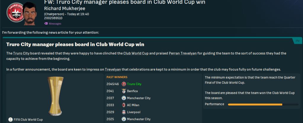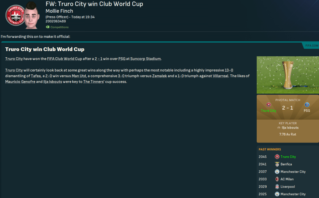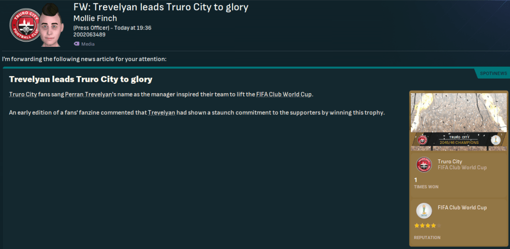Trevelyan signed out of football management after 23 years at Truro City by winning the Premier League, Champions League, Carabao Cup and Charity Shield after lifting the Club World Cup. He was delighted with the team’s performance in his final season, and believed they’d truly cemented themselves as the best club in the world.