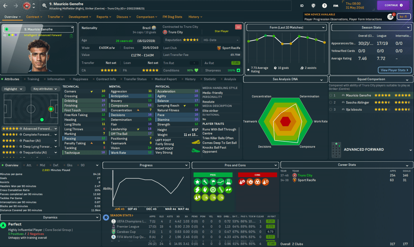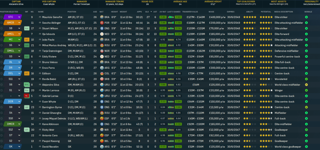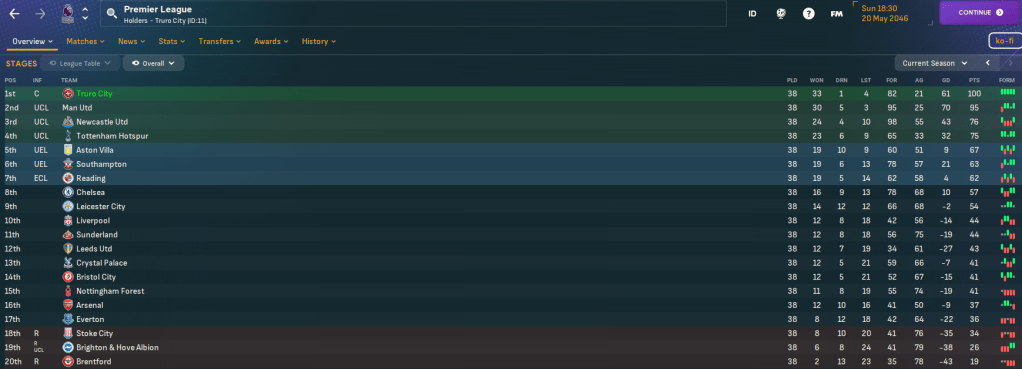 Truro set a new record for most wins in a Premier League season, surpassing Man City’s 32 in 2018. They racked up a high of Trevelyan’s reign, finishing on 100 points after 33 wins, 1 draw and 4 defeats, scoring 82 and conceding just 21. Genofre was the best player in the league with an incredible 7.72 average rating, scoring 19 in 17 games. That was followed by Ablinger, who was the top assister with 12, on 7.52, and David Navalón broke his own clean sheets record with 22, only conceding 18 in 35. Ablinger won the Football Writers Football of the Year and PFA Player of the Year, Trevelyan won his fourth Manager of the Year award, and Navalón, Parra, Euan Whyte and Veloso made Team of the Year.