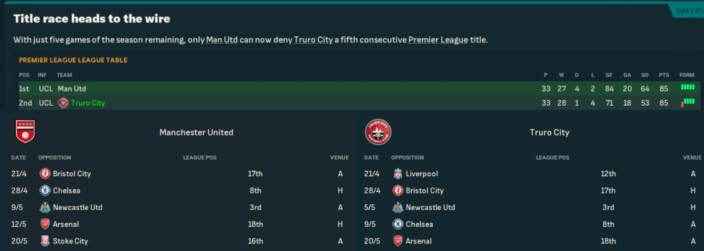 Game 4 – Chelsea (8th, away): For some reason, Truro played their penultimate game before UFC played their 36th. Genofre was at the double again to secure an easy 3-1 win at Chelsea. UFC then scored a 93rd-minute goal to nick a 2-1 win at Newcastle but, a few days later, only drew 1-1 at home to Arsenal. That secured Truro’s fifth successive Premier League title!