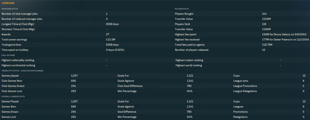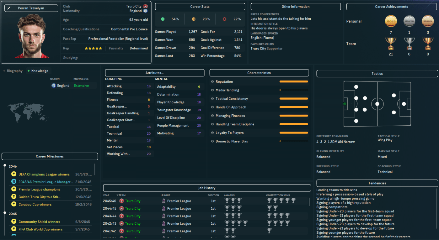 Trevelyan led Truro into battle 1,267 times in his 8,362 days at the club. Of those games, he won 690, drew 294 and lost 283, scoring 2,121 goals and conceding 1,341, departing the club with a 54% win ratio. He lifted 8 league titles, secured 5 promotions and won 13 cup competitions. During that time, Trevelyan spent £528m on 144 players and accrued £306m for 118 players. His biggest signing was left back Bruno Veloso for £60m in 2043 and his biggest sale was midfielder Dieter Peterson to Inter for £77m in 2045. And he departs Truro having earned a cool £22.5m.