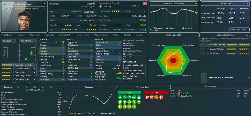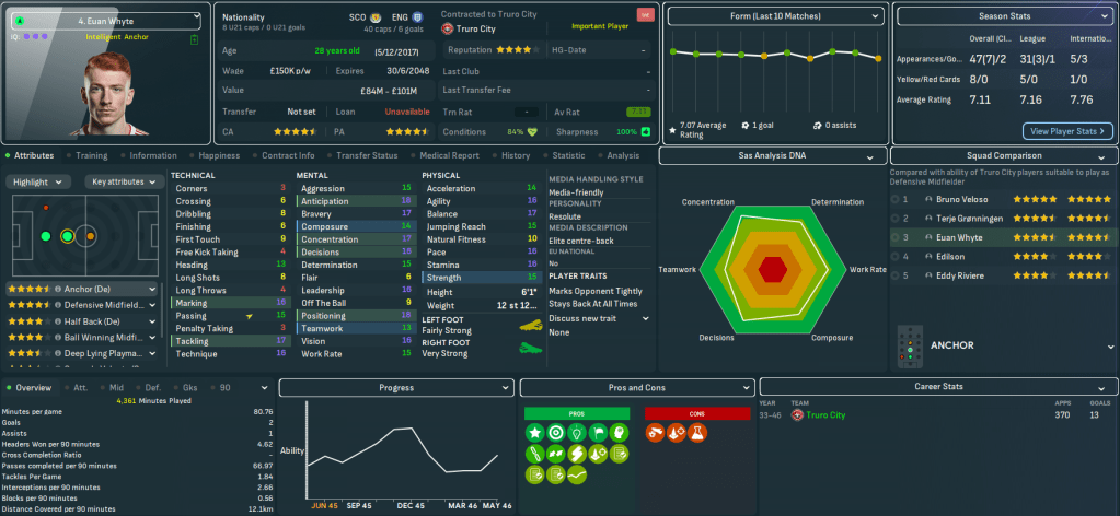 Kane Atkinson: Another one-club man, holding midfielder Atkinson has racked up 349 league appearances for Truro, scoring 15 with 31 assists, since making his debut in 2035. And he’s still only 26. He’s not exactly a headline grabber but he did the hard work Trevelyan needed in the midfield engine.