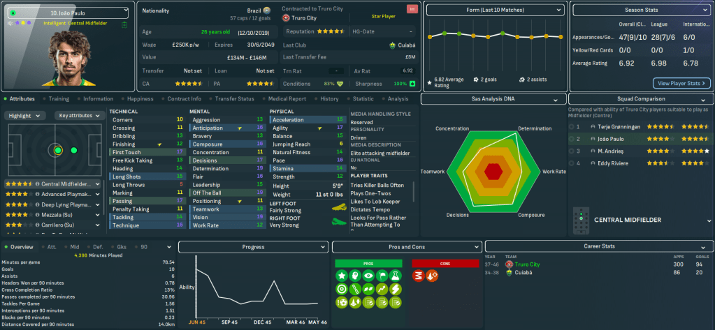 Alejandro Silva: Initially signed on loan in 2036, Silva joined permanently for Truro’s promotion campaign in 2037. He swiftly became captain and a permanent fixture in Trevelyan’s midfield, contributing 75 assists and 35 goals in 331 league games. He’s also scored 2 in 55 caps for Uruguay.