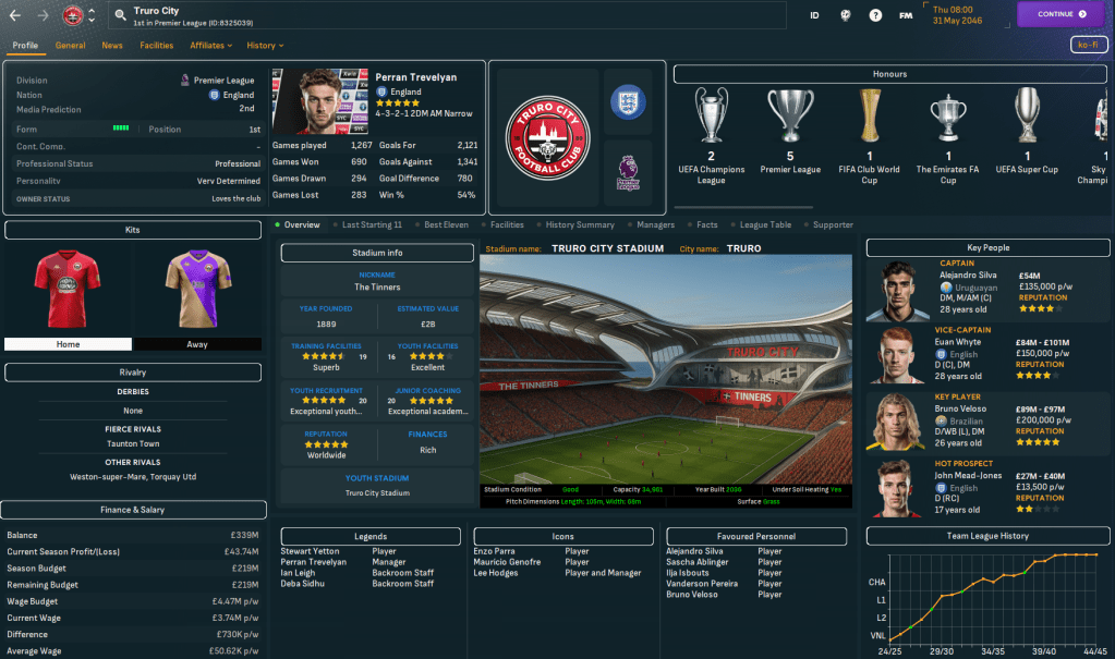 But Truro also enjoyed success in continental football, even though they oddly only ever played in the Champions League. They lost to UFC in the quarters in 2042, then reached the Final four years in a row. They won the first by beating Newcastle on penalties, then lost to Real Madrid on penalties and UFC in 2045. But they crowned Trevelyan’s final season by beating Real Sociedad 2-0 in his final game in management. Earlier that season, they’d conquered the world by beating PSG 2-1 to win the Club World Cup. In total, Trevelyan led Truro to: