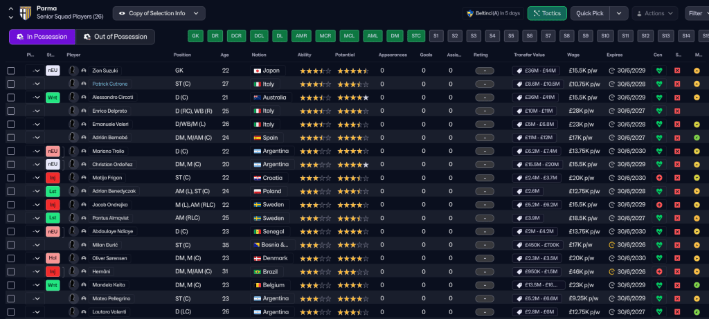 The best player at Parma is 22-year-old Japanese goalkeeper Zion Suzuki, along with striker Patrick Cutroni, 21-year-old centre back Alessando Circati, right back Enrico Delprato, left back Emanuele Valeri, midfielder Adrián Bernabé, centre back Mariano Troilo, midfielder Christian Ordóñez and striker Matija Frigan, who’s out for the entire season with a torn ACL. While youngsters to keep an eye on include 18-year-old midfielder Doro Diop, 17-year-old centre back Karlo Pajsar, 12-year-old full back Mathias Fjørtoft Løvik and winger Benja Cremaschi, who’s on loan from Inter Miami. However, Rinaldi had noticed a couple of issues with newly signed non-EU players not being eligible for registration, which sounded like a disaster in the making.