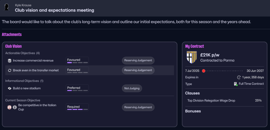 So we’ll be back with Part 2 of Tardini Tales as we delve into Alessio Rinaldi’s first few games as a Football Manager over the weekend!