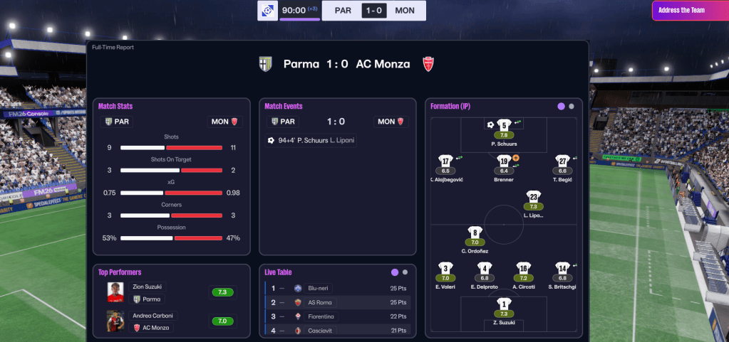 Despite the slight tactical issues, Parma had dug in and build a solid run of form. Rinaldi was extremely thankful to Suzuki for keeping their opponents out, but knew they needed to prevent teams from having shots at will through the remainder of the season.