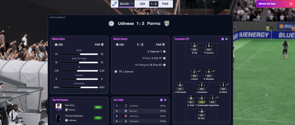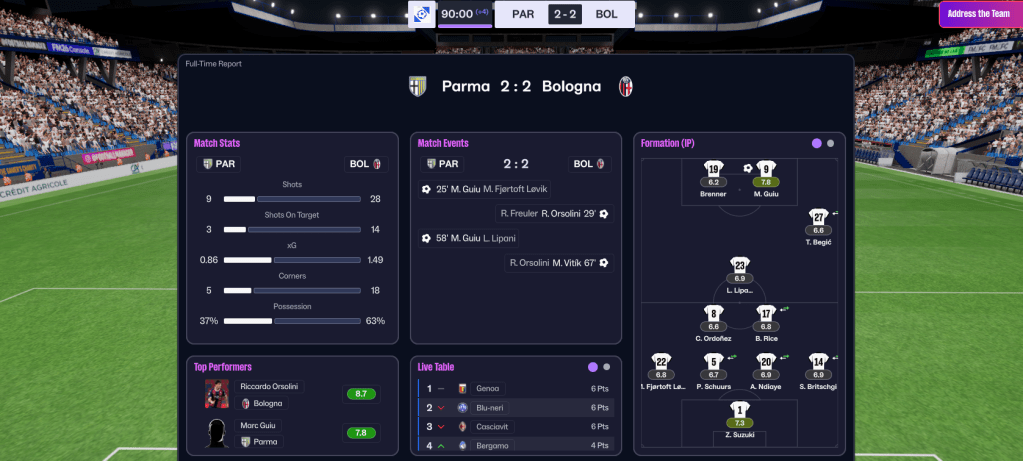 Parma began the campaign with a trip to Pisa and went behind with some dreadful defending after 8 minutes. Rinaldi laid into the team and got a response as debutant striker Brenner turned and finished nicely 10 minutes after the break. Parma completely dominated the game by 23 shots to 8 but couldn’t score and were frustrated to draw 1-1. Their first home game saw Bologna come to town and dominate for large periods. However, Guiu scored two excellent goals that were swiftly cancelled out both times. A tricky start continued with a 3-1 defeat at Atalanta before hosting Fiorentina, who won a penlty after 16 seconds, still managed to score twice in the first half and went on to win 3-0 despite having 7 fewer shots.