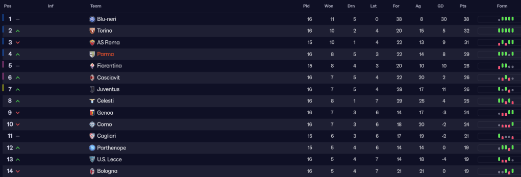 And all of a sudden, that strong run had Parma sitting pretty in 4th place heading into the new year. They’d only lost three times, but only scored 22 and conceded 14 in 16 games, thanks largely to the performances of Zion Suzuki again. The goalkeeper had the most clean sheets (8), the most saves (88), by far the best xG prevented (1.4) and 7.21 saves per 90 minutes. Meanwhile, Inter were back on track and still undefeated.