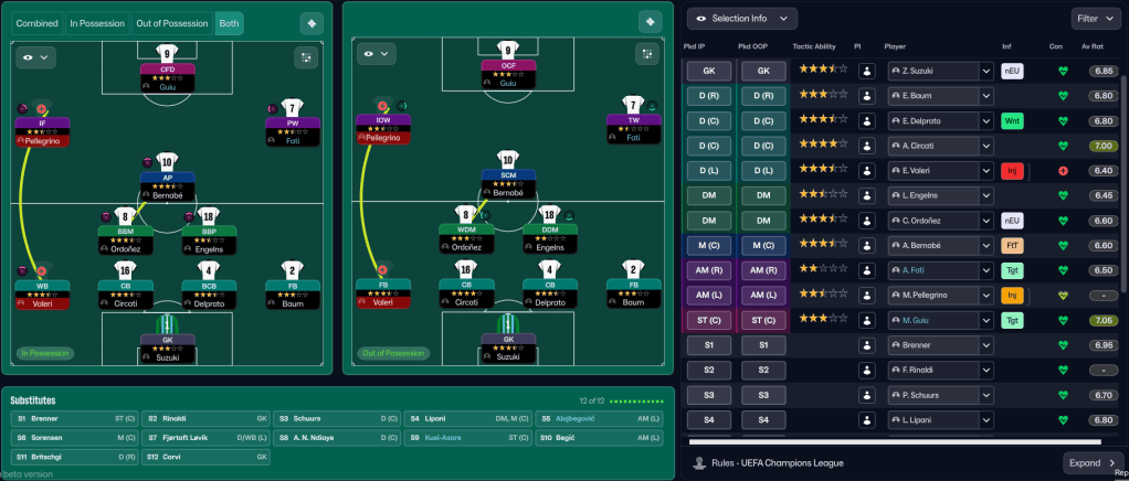 First up was a huge game as they ravelled to Club Brugge and started well as Brenner steered home after a lovely move. And that was all they needed for a 1-0 victory (with stats oddly not working!) A much tougher game followed as Parma entertained Man City, who unsurprisingly scored through Haaland. Parma held out until 76 minutes, when Haaland added a second with a lucky deflected goal and they scored two more, including a fourth that was miles offside!