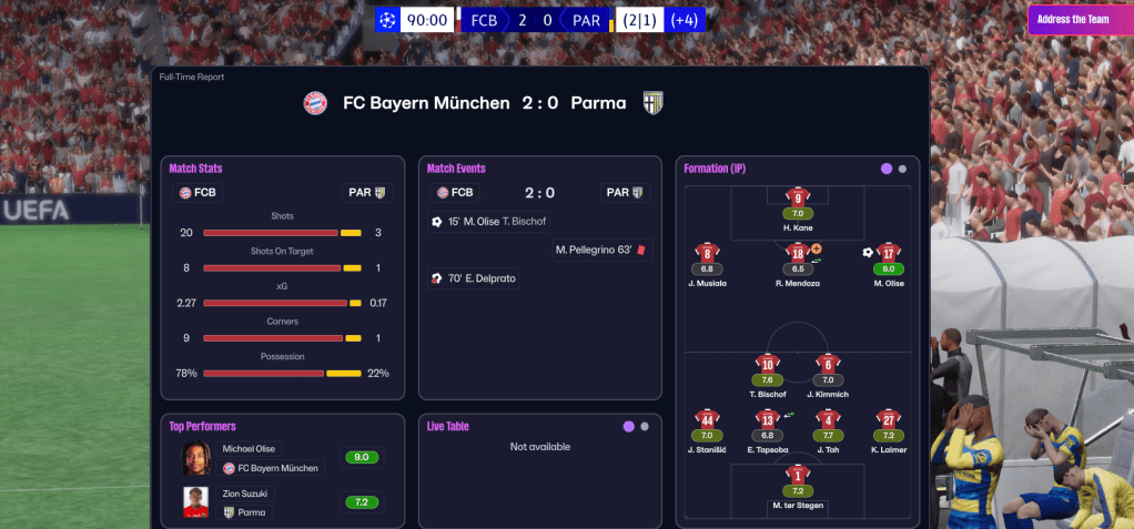 Rinaldi rested the first 11 for a trip to Juve (and of course lost 2-0) to keep them fresh. Olise left Valeri for dead to open the scoring after 15 minutes and Bayern absolutely dominated. They held out until Pellegrino gave the ref a chance to have an impact and he obliged, showing the winger a harsh straight red, and Parma instantly crumbled by giving up an own goal. And, despite a really good effort, Parma were out of Europe. But for context, Kane and Musiala’s £375k-per-week wages are more than half of Parma’s entire budget of £718k, so this was a pretty good effort.