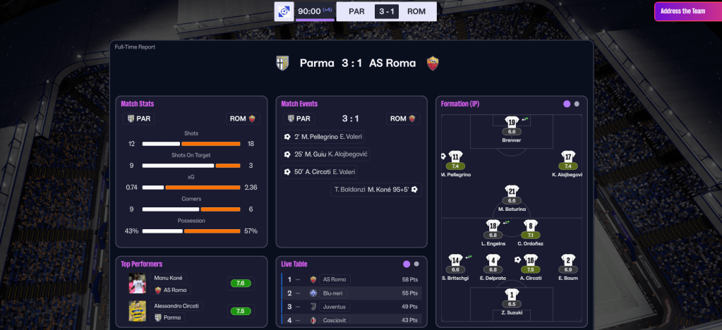 2027 began with two really tough games as Parma lost 1-0 at Napoli, but centre back Perr Schuurs nicked a surprise 2-1 win at home to previously unbeaten Inter. Brenner nicked a 1-1 at Torino and Guiu did the same at home to Atalanta before earning a dull 0-0 at Fiorentina, and a tricky spell continued with a 2-0 loss at Bologna and 2-2 at home to Torino. But that poor run ended with Lipani’s first goal for the club nicking a tame 1-0 at home to Pisa.