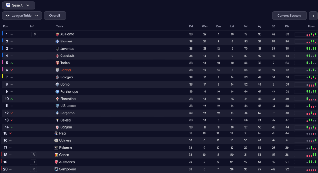 That slightly disappointing result summed up a season that promised plenty but was largely frustrating. That said, Parma still finished 6th on 62 points (8 fewer than last season), after 16 wins, 14 draws and 8 defeats (3 fewer wins and 2 more defeats). They scored 52 and conceded 38, which was 4 more and 12 more than last season. Roma, who only drew once all season, secured the title on the final day as they and Inter both lost.