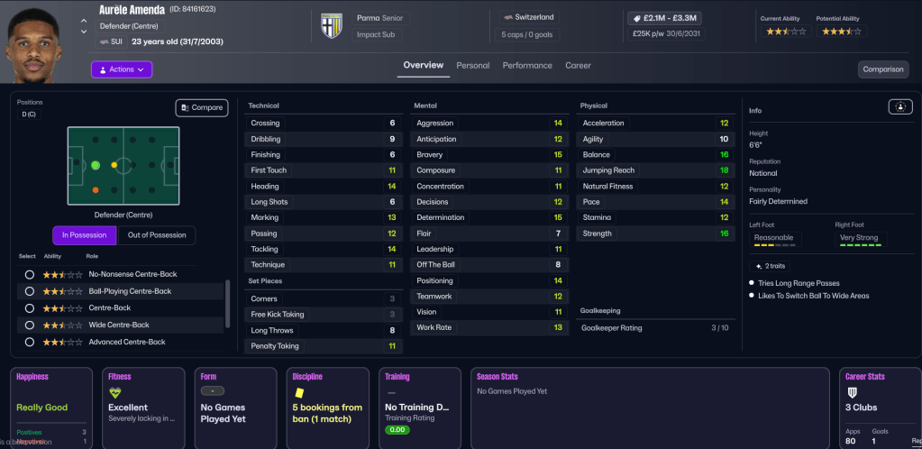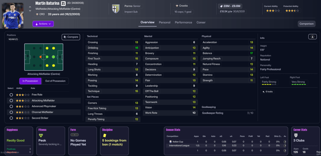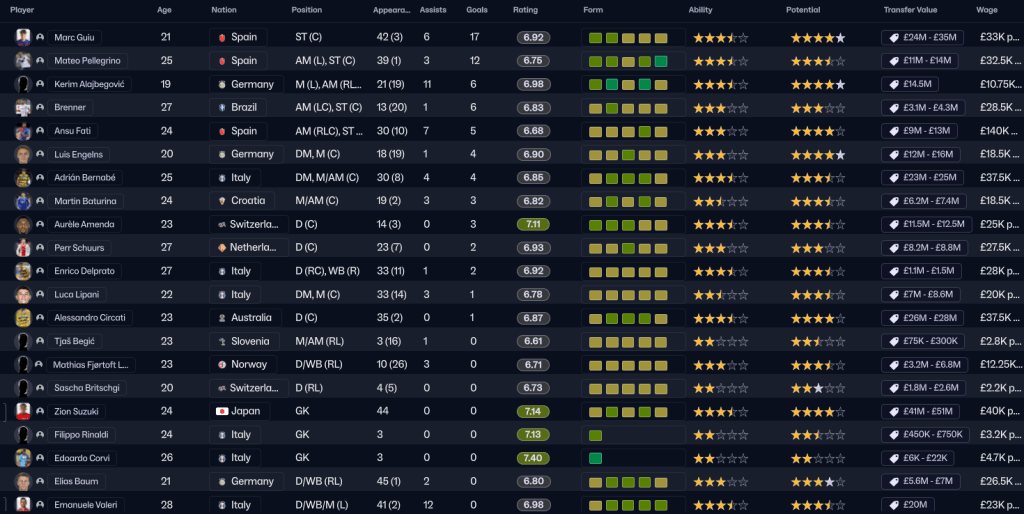 Rinaldi knew Parma would drop off from last season’s high, but was still surprised they managed to finish as high as 6th. He’d been disappointed by some signings, especially Fati, who only delivered 7 goals and 5 assists in 40 games, and some of the young midfielders hadn’t really delivered. Guiu was very inconsistent, despite leading the way with 17 goals in 45 games, followed by Pellegrino (12) and Alajbeovic and Brenner (6). Valeri led the way with 12 assists followed by Alajbegovic’s 11. Positives included Amenda, who had a 7.11 rating in 17 games, and the impressive Suzuki, who had a 7.14 rating from 44 games.