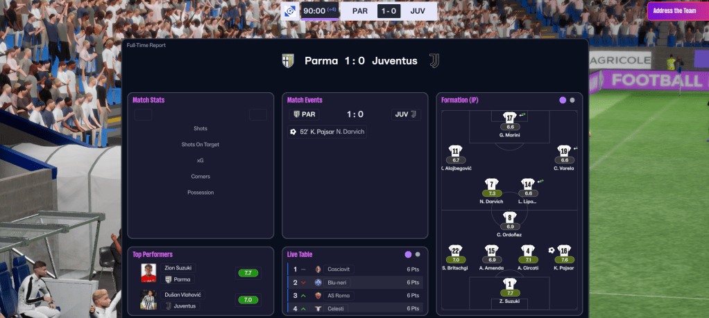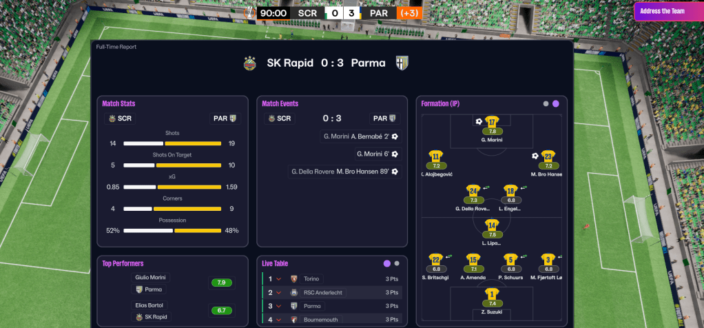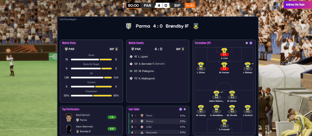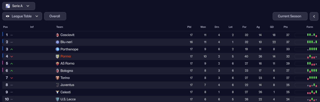 Pellegrino and Alajbegovic earned a hard-fought 2-1 win at home to Young Boys before the toughest game of the league stage at home to Spurs, in which Baturina’s late strike nicked a point. A rotated team nicked a 1-0 win at Braga and won 3-1 at Saint-Étienne through Alajbgovic, Bro Hansen and Baturina goals. That saw Parma sitting comfortably in 4th on 16 points, and critically 4 points above 9th place.