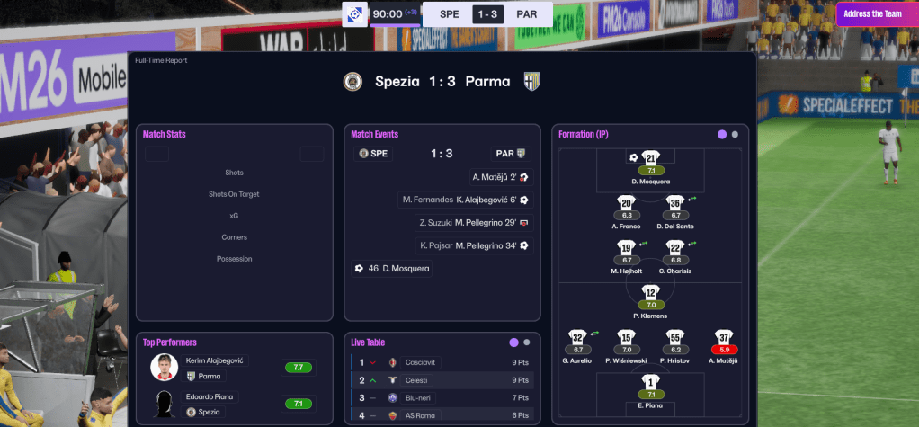 The good results continued at Atalanta, where Pellegrino scored early before a quickfire Alajbegovic double and De Roon was sent off for chopping down Bernabé. And, despite the second half no kickoff bug, they went on to win 5-1 thanks to Alajbegovic completing his hat-trick and Varela’s first goal for the club. They took that performance into a home clash with Catanzaro as Pellegrino turned home Bartesaghi’s cross, then laid on Darvich’s first Parma goal. Varela crossed for Alajbegovic to head in a third as Parma racked up 16 first-half shots, before Varela, Pellegrino’s second, Baturina and an Alajbegovic 30-yard half volley wrapped up a 7-1 thumping.