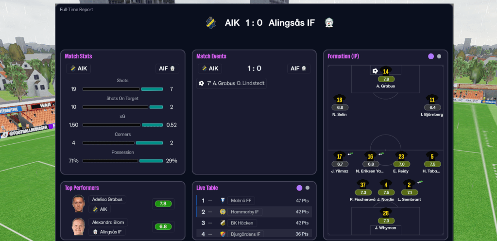 That defeat saw Alingsås relegated to Elitettan with four games remaining, leaving Holm already sweating over her future. They improved slightly in a 2-1 defeat to Växjö, before getting dominated at 13th-place Rosengård and being really unlucky to lose 3-2 at home to 2nd-place Hammarby. But it was very clear that Alingsås were nowhere near good enough to compete in the top tier. However, they came out flying in the final game of the season as, Holm tinkered her tactics to copy the rest of the league with a 3-4-3. Lundin was twice played through to score one-on-one with the keeper and completed her hat trick after 27 minutes… only to inevitably concede from a cross. The dreaded halftime freeze followed, but Alingsås held on to earn Holm’s first win as a Football Manager!