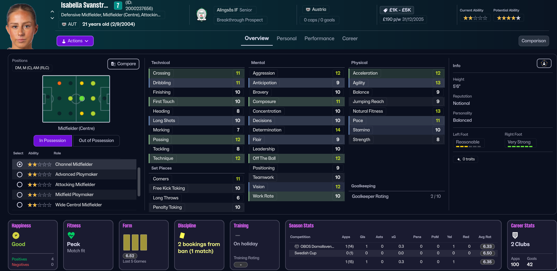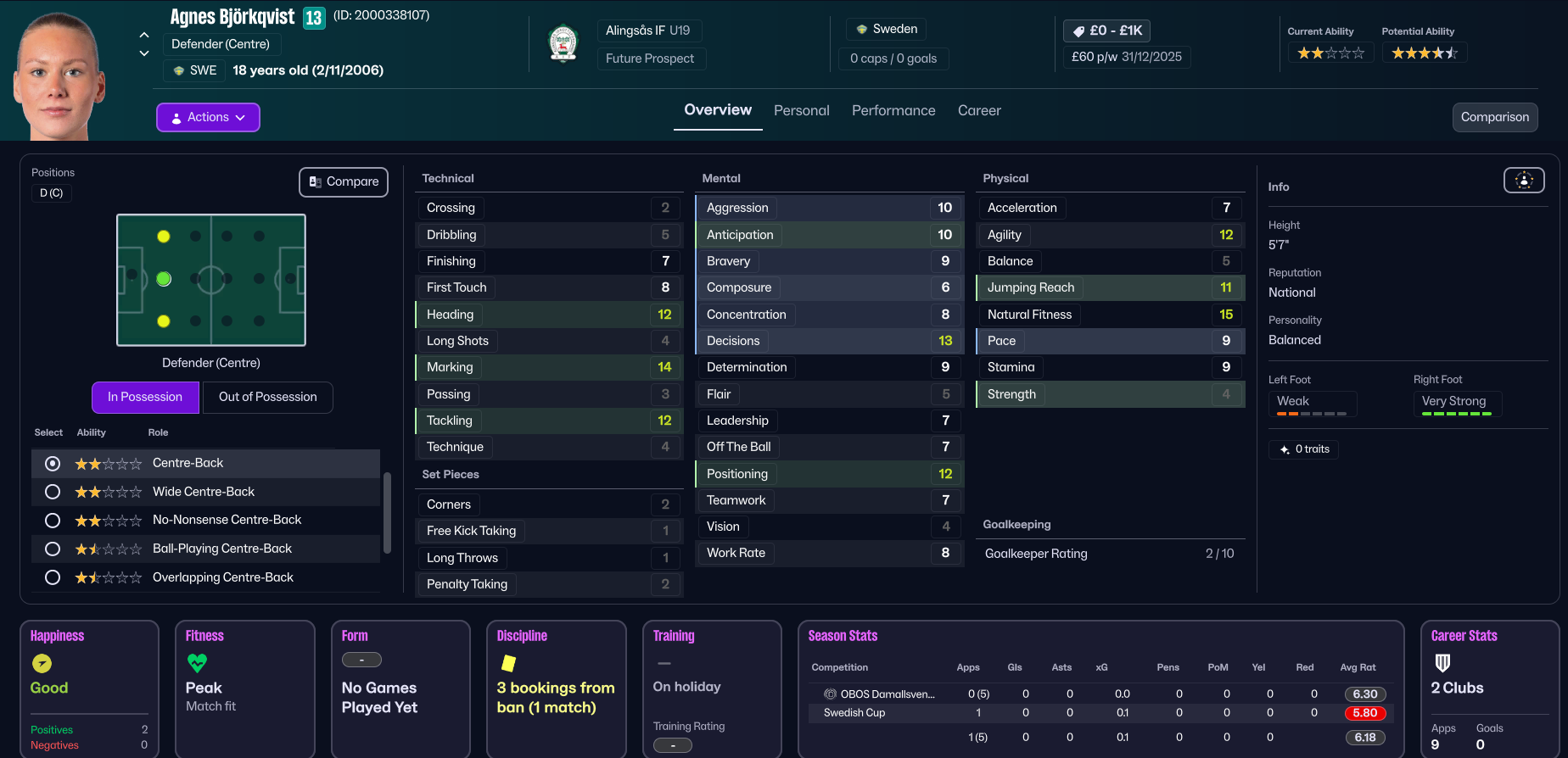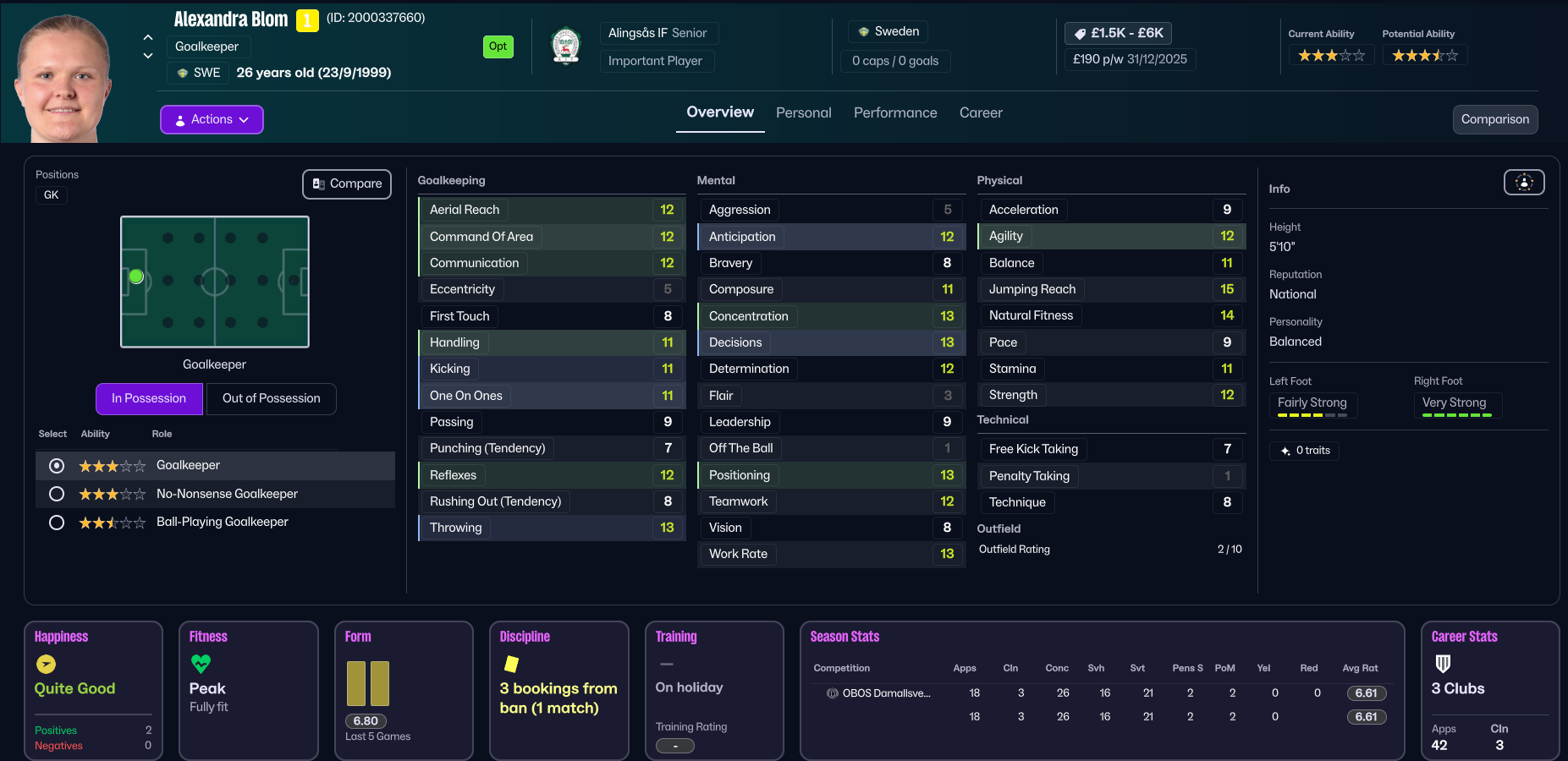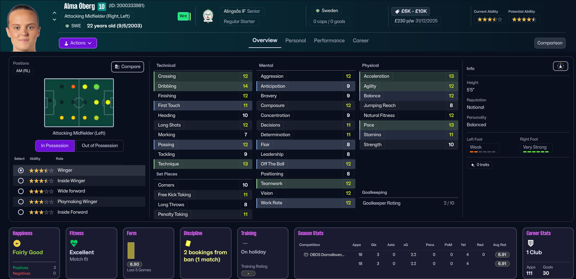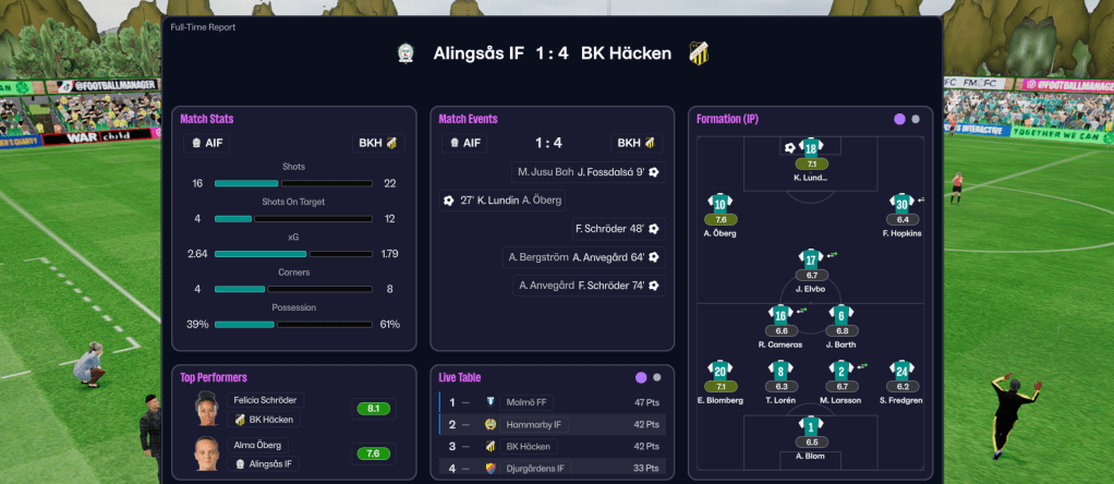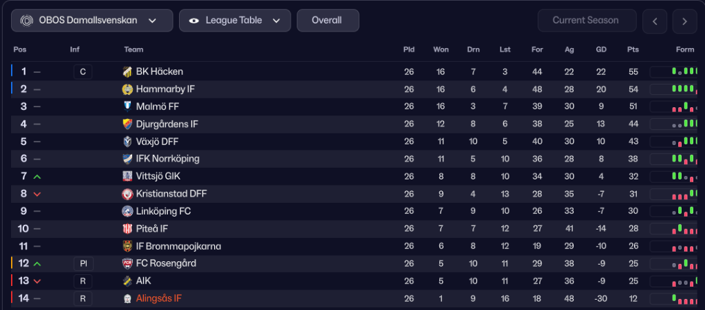 We previously mentioned Alingsås IF as potentially the most difficult club challenge on FM26 in our Guide to Women’s Football, so Freja faces a massive test in her first role. That challenge is portrayed in-game as, at the end of September, Alingsås IF are bottom of Damallsvenskan without a win and just 9 points after 19 games of the 26-game season. The club is 10 points away from survival with 7 games remaining, meaning relegation is virtually inevitable.