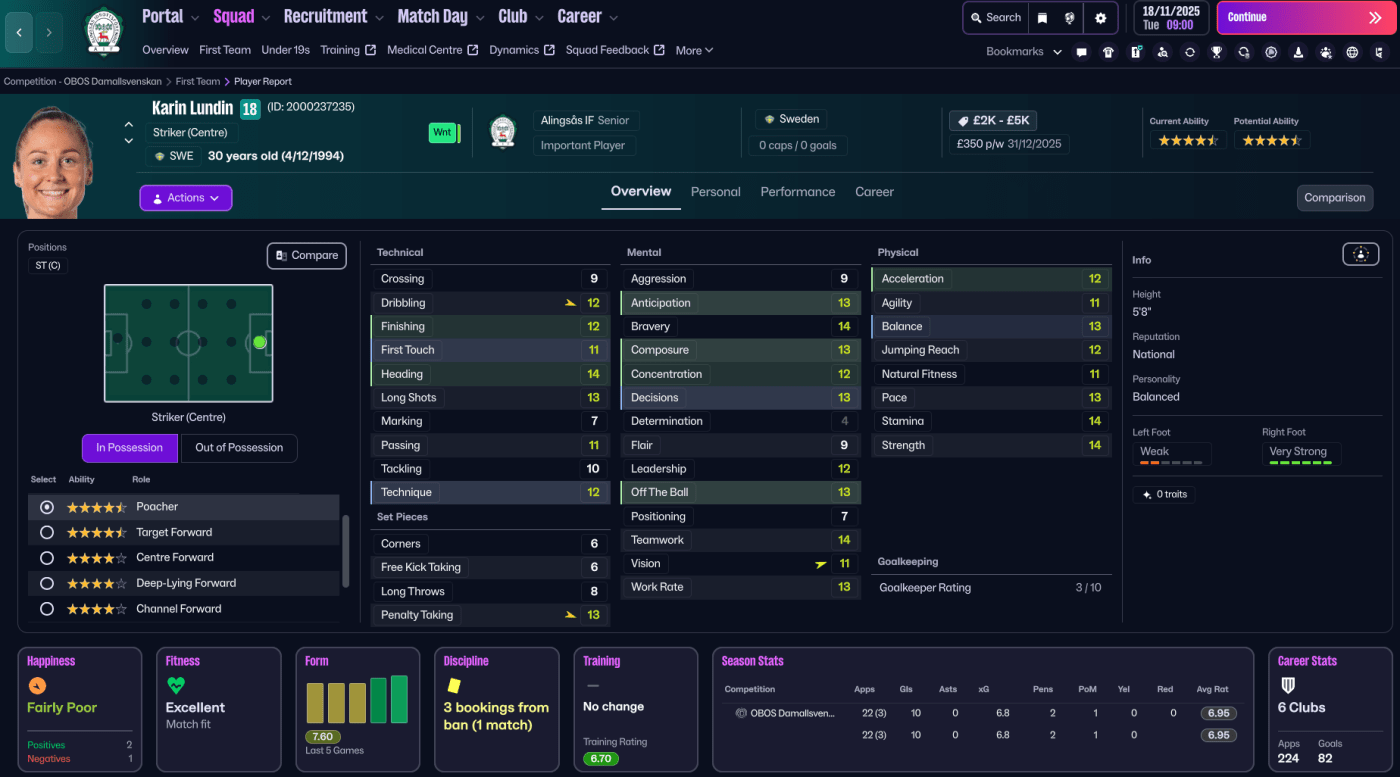 We previously mentioned Alingsås IF as potentially the most difficult club challenge on FM26 in our Guide to Women’s Football, so Freja faces a massive test in her first role. That challenge is portrayed in-game as, at the end of September, Alingsås IF are bottom of Damallsvenskan without a win and just 9 points after 19 games of the 26-game season. The club is 10 points away from survival with 7 games remaining, meaning relegation is virtually inevitable.