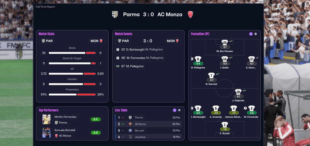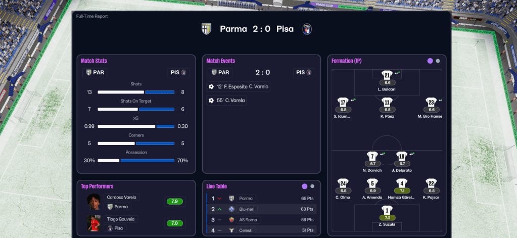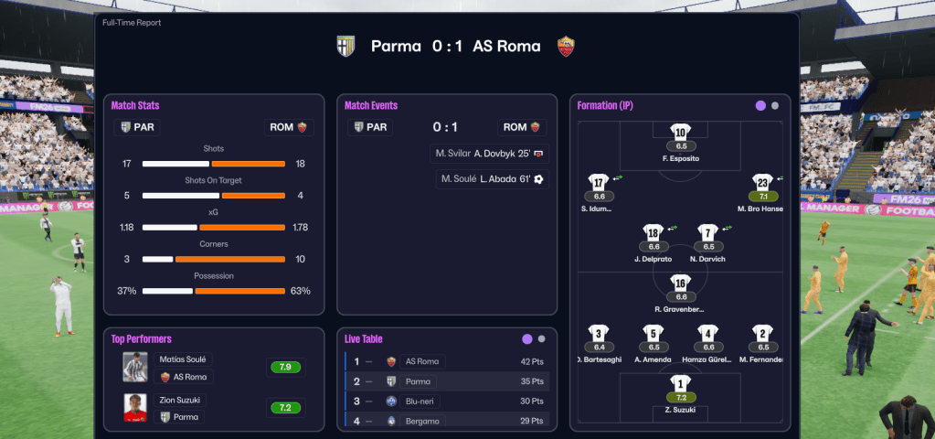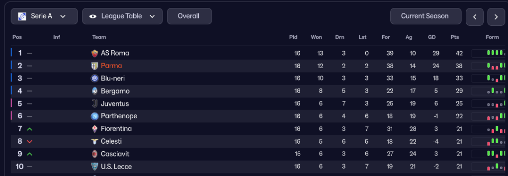 The unbeaten start ended with, unsurprisingly, a defeat to bogey team Lazio. A week later, in Saudi Arabia, they got revenge with a 3-1 Italian Super Cup victory before beating Milan in the Final to lift a second piece of silverware of Rinaldi’s reign. The 2020s wrapped up with a huge game as 2nd place Parma hosted surprise leaders Roma. Roma had the best of the early stages, including Suzuki saving a penalty and eventually took the lead from a corner. But Parma missed a mass of chances and hit the bar four times to lose 1-0 and put still unbeaten Roma 4 points clear.