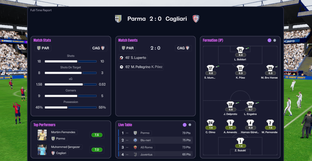 Parma began the season with a massive game at home to the champions Inter and with goalkeeper Zion Suzuki injured. Inter came out strong, but Parma grew into it and a clinical Gravenberch throughball found winger Cardoso Varela to slide past Ederson in goal. The winger turned creator just after the break, crossing for Francesco Pio Esposito to again score against his former club. Dumfries was sent off for a shocking challenge on Páez and Parma eased to a 2-0 victory.